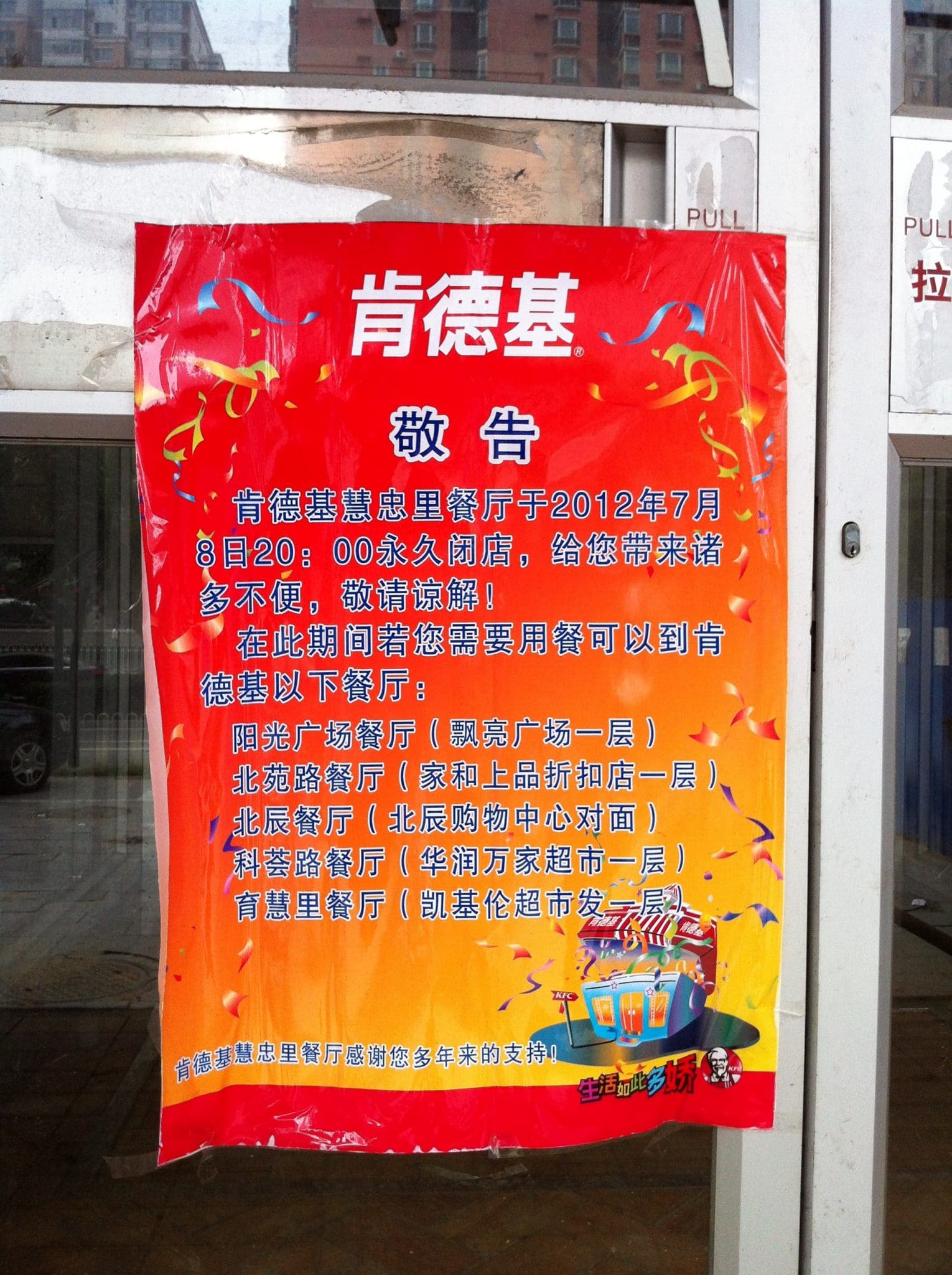 然后7月7号莫名其妙的早上起来就发烧,这个时间也是我看了那通知后才知道的,之前只知道那天是周六,当时心里还想:好端端的周末发烧一天气死我了。然后那天特难受一天也没吃东西,晚上感觉好一点了,穿的挺厚的去离得很紧的个超市随便买了点水果和吃的就回来了,也没正经吃饭。第二天周末,也就是7月8号感觉还是难受,随便吃了点东西,就在床上躺着,直到晚上感觉好点了,也感觉饿了,就想去吃肯德基,当时已经9点多了,肯德基10点关门,心里想来得及 来得及,吃不完人家也不可能赶我吧?然后就很随便的穿衣服往那走,因为本来肯德基在的那座楼就已经在整修了,那楼叫什么文化什么,我搬来的时候那楼的正门就关着门,我也不知道是干什么的,然后那楼就这么一家肯德基在营业,直到后来整座楼开始整修了,索性肯德基没受影响,门上还贴着白纸黑字的打印纸“正常营业”,很万幸。然后这次过去就发现肯德基的招牌不见了,然后往里望,灯已经大部分都关掉了,隐约能看见几个服务员,因为戴着那种灰帽子很显眼,然后门口个施工的人跟我说这已经不能进了,当时我饿着肚子脾气不好,心里还唾了那人一句,就去了路口那面的麦当劳。第二天早上周一了因为还有早上跑步的习惯,早早的就起来了,然后心里知道那肯德基可能会不营业,跑回来没地儿吃饭,所以没去跑步,就呆到时间到了去上班,稍微早点出了门,因为地铁站在西边,往东走其实是走冤枉路,所以早点出去看了看那肯德基怎么样了,去了果然就发现全拆了,然后心里想的可能要等到整座楼装修好了再开业吧,看来要等好久了,然后后来几天就没再往那去。有一天下班后回来,因为已经天黑时间不早了,也来不及做什么了,回去只能睡觉了,所以就闲的说再去那个肯德基看一眼,因为天黑了嘛已经,走到那隐隐约约的能看到门上贴着的红色的两张纸,第一反应就是可能是通告吧,然后说:啊,我们这暂时整改装修,给您带来的不便敬请谅解,将来弄好了再开门,敬请期待,Coming Soon.. 当时心里还是没多在意,也没停下来走过去详细看就很自然的走过去进院门然后回家了。第二天早上心里还是有点挂念这事,所以又早起走过去看那通告,这次还是装自然的从那走过去,虽然一直扭着头在瞅那张纸,这次第一次看清楚了,虽然曾经想过是否会关掉,但是没多想,这下确认了,就是关闭了。那个“永久关闭”特别显眼,我说你贴这东西干什么?啥都不贴,啥都不写,让我抱着期待,慢慢的等着这装修好,吃饭的地方慢慢的有了别的习惯的解决方案,然后随着时间流逝慢慢的淡忘了这多么好?一句“永久关闭”打破了原本所有的以为,你写个“关闭”我也会以为还会再开业啊,你一句“永久”弄得我一点想象的退路都没有。还有为什么时间写的那么具体?不写时间会死啊,写了谁会在乎你哪天哪刻关的门啊?还写的晚上8点,成心让我知道我就差一个小时多一点没赶上?而且关门前几天服务员还给我了些优惠券,跟我说这是7月16号以后的优惠券,我回家一数:嗬!8张啊!给我这么多,明明知道我去了也会忘带这种东西,还给我这么多,哈哈。但是你给我撑到16号啊,你这不玩我么。你通告里写的那五个备胎地儿我确实在这里关门后去过其中两个,但是都会远,有时候就会在那算计:是去那个要过两个短路口的,还是去那个要过一个长路口的?这下好了,备胎通过蹊跷的方法转正了。然后就第一次有了标题里的那感想。准备去拍文章里那张通告的照片是第二天早上。因为有点失眠,第二天早上起来的实在不是很早,出家门时手机里最后一个闹钟已经响过了—8点42分的。然后当时还在纠结要不要走这冤枉路去拍那个通告的照片,也不明天着?最后还是一狠心过去了,但是那个地方往北一点有个公交站,上班时间人流还是挺多的,我又装自然的往那走,一看人这么多,就想我还停下来照么?人家会怎么看我这个白痴的行为?然后一下子想多了,脚步也没停下就走过去了,然后心里超懊悔,然后当时心里突然就划过这里关门那天不就因为去晚了那么一个多小时就再也见不到了么?然后心里一想不行,就掉头往回走,心想不能再错过什么,要是今天不拍下来,明天周六(也就是我写这文章的这天)早上还不知道几点才能醒,醒了再去的时候这东西被撕掉的话,再错过一次,我不后悔死啊!然后就在那有点小激动的往回走,虽然时间已经有点晚了,然后走到门口,点开手机上的相机后发现站了台阶下面拍的话离得还有点远,调调焦距的话,可能会因为像素的问题而拍的不清楚,索性就走上那台阶去,又发现明显手的高度比那通告高很多,然后就蹲下拍(真不知道身后的人会以为我在干嘛),我这人一激动手就会和肾虚似的有点抖,然后用力的忍住,按下屏幕上的那拍照按钮,然后一看,哇靠!真的给抖模糊了啊这是?然后手机卡了一下又给变清晰了,呃嗬,用了快两年的手机依然很给力啊,很清晰,然后就很满意的站起来继续往地铁站走。